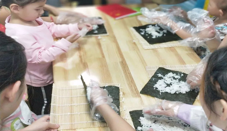 结束时装秀,进入旅行【第三站?韩国】,开启韩国寿司之旅。现场围绕韩国的寿司元素,宝贝们和爸爸妈妈一起亲手制作我们的美味寿司哦!瞧,我们有模有样的呢~