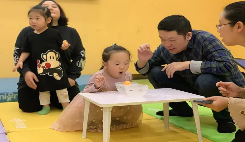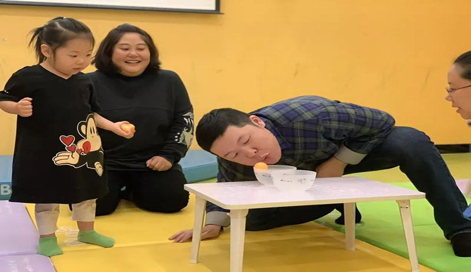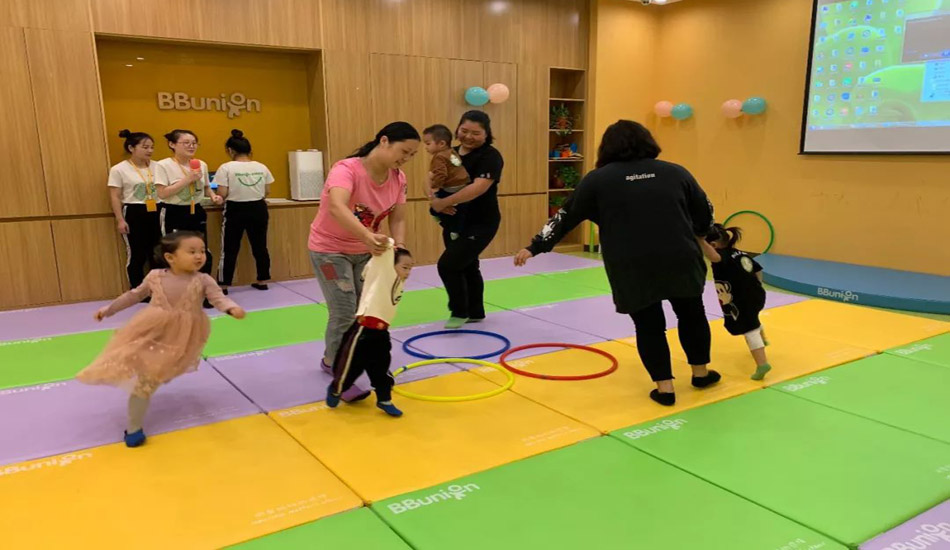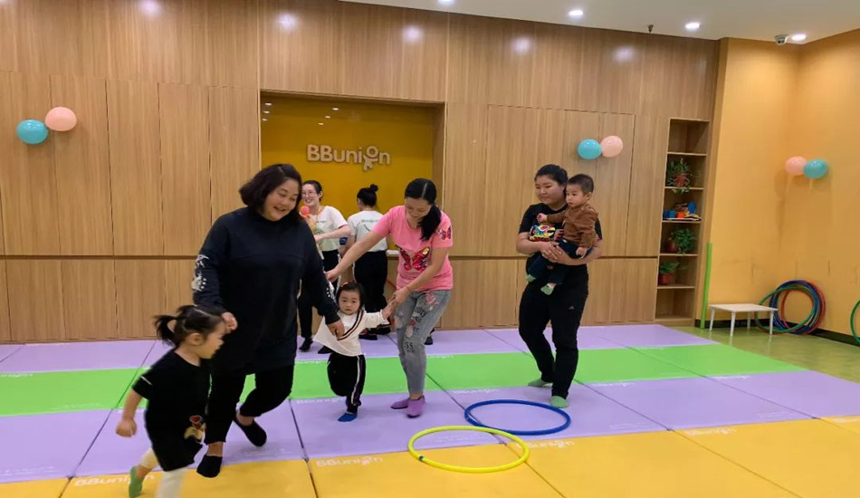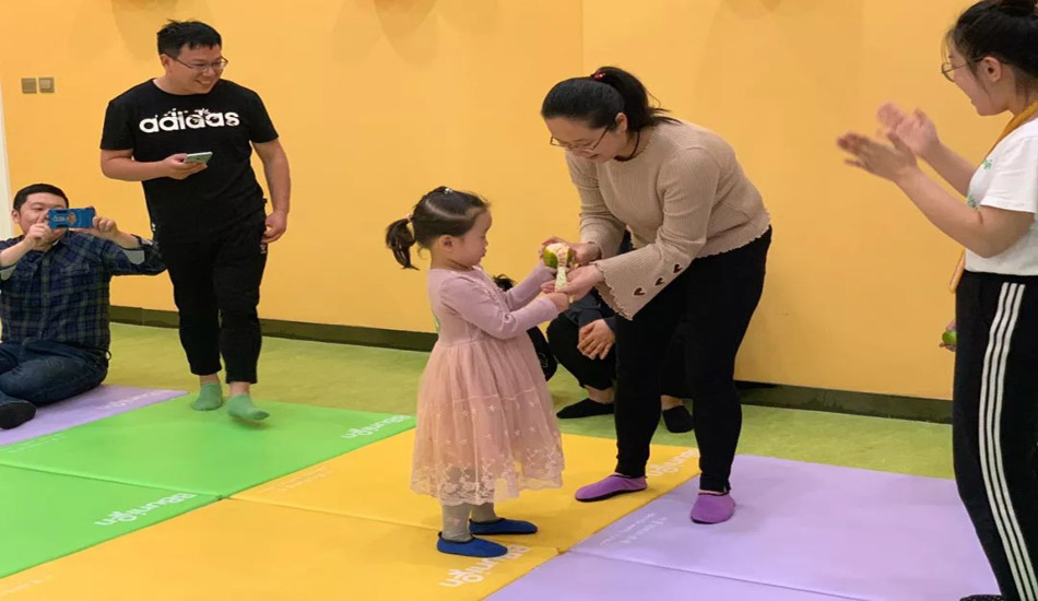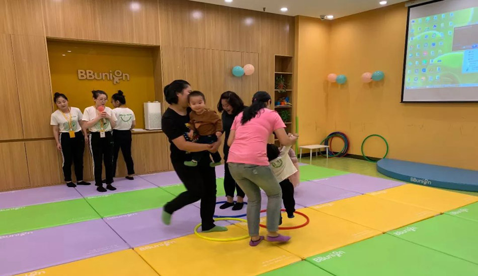 宝宝们在爸爸妈妈的带领下开始跟着老师舞动自己的身体