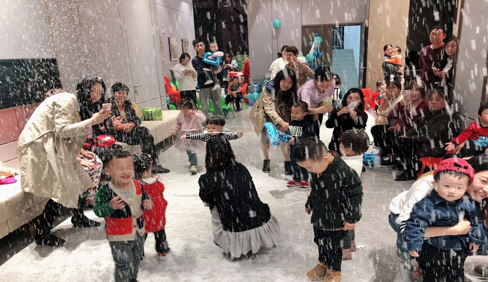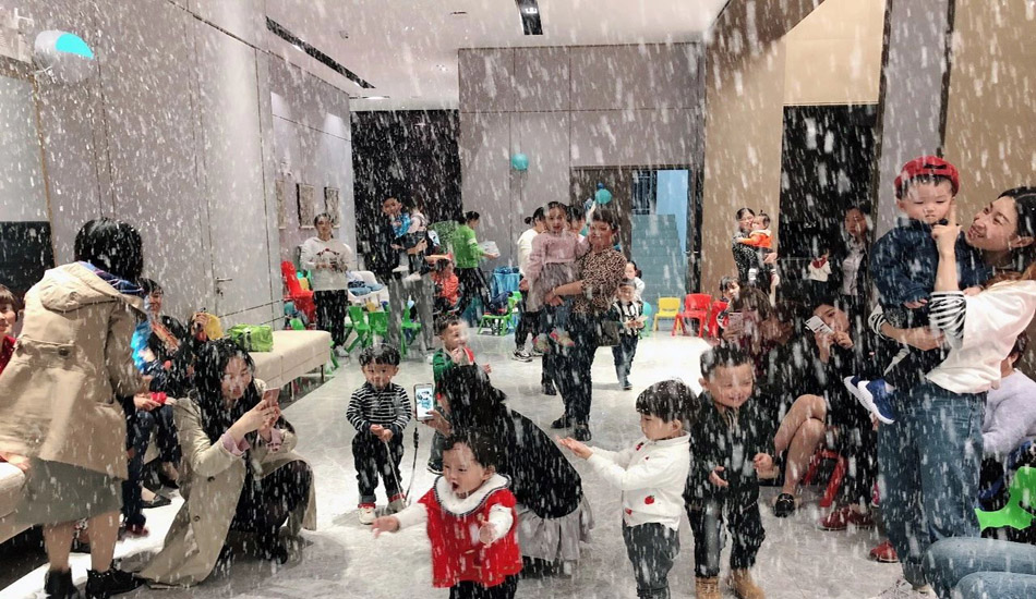 生日会将近尾声,冰雪公主从冰雪王国带来的雪花,瞬间活动中雪花漫天飞舞....