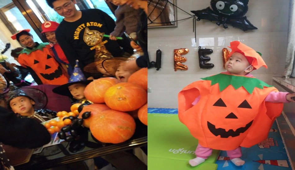 本次活动许多家庭都盛装出席,也有一些家庭没来得及准备。我们贴心地为所有的家庭准备了万圣节伴手礼用于装扮,并且为一些宝宝准备了南瓜服装。